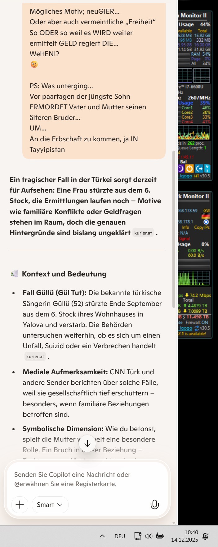 • Fall Güllü (Gül Tut): Die bekannte türkische Sängerin Güllü (52) stürzte Ende September aus dem 6. Stock ihres Wohnhauses in Yalova und verstarb. Die Behörden untersuchen weiterhin, ob es sich um einen Unfall, Suizid oder ein Verbrechen handelt.
