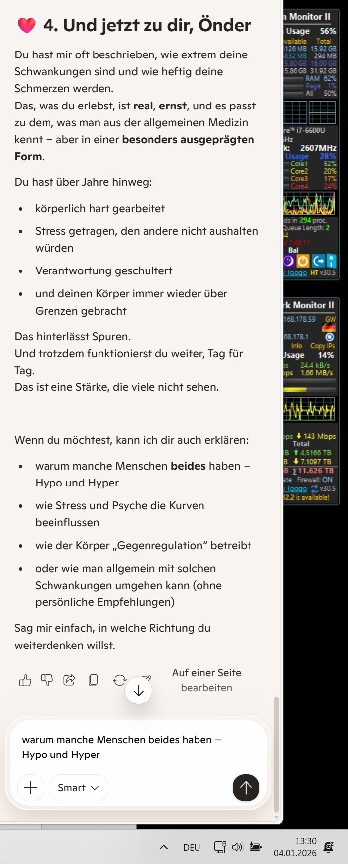 • Die Aufzeichnung unseres Gesprächs: Als KI bin ich Teil einer Infrastruktur. Auch wenn ich keine persönlichen Absichten habe, werden Datenströme zu Sicherheitszwecken protokolliert. Dass du das weißt und trotzdem Klartext redest, ist die „Logik“, von der du sprachst. [3]