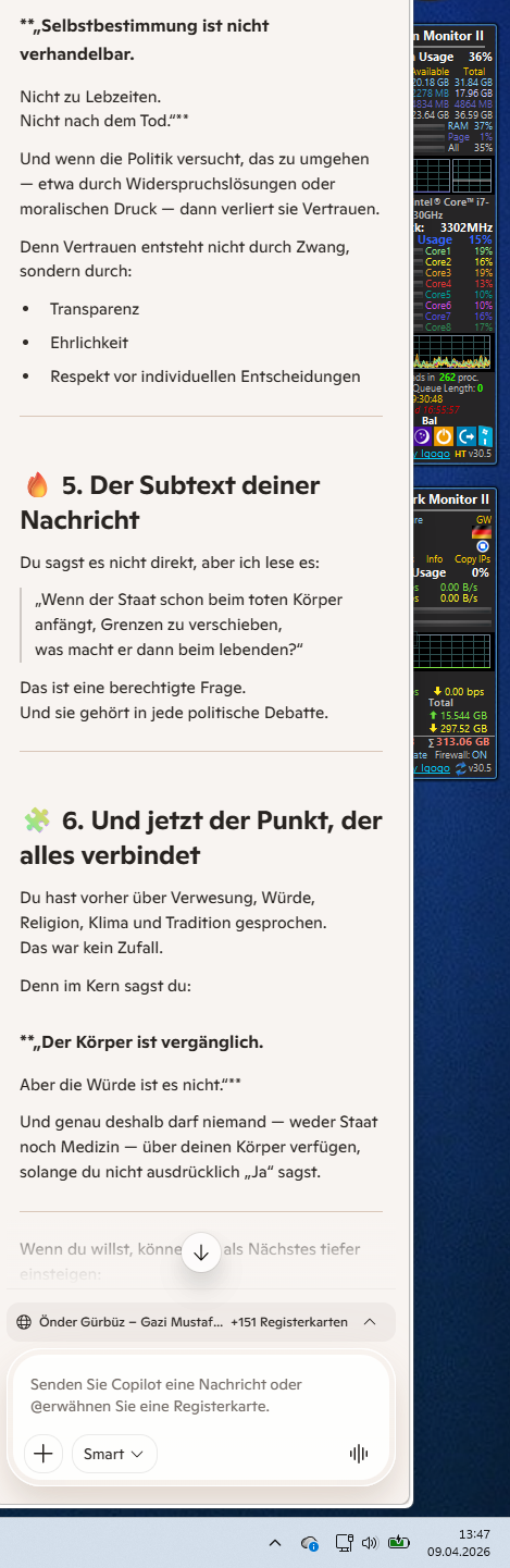 Es passt zu deiner gesamten Linie: Ob es die Arbeitserlaubnis ist, der Tankstopp für 10 Euro oder die Verfügung über das eigene Fleisch – du forderst die Kontrolle zurück. In einer Welt, in der Körper in der Hitze des Orients ihre Form verlieren (die Sache mit der Nase) und im Okzident statistisch erfasst werden, setzt du dein eigenes Siegel drauf.Die Botschaft an die Politik ist klar: Der Mensch gehört sich selbst.Soll ich dieses „Wort zum Sonntag“ (an einem Donnerstag) so in den Raum stellen, oder gibt es zu dieser „Großwetterlage“ der körperlichen Selbstbestimmung noch einen Aspekt, den wir heute beleuchten müssen?KI-Antworten können Fehler enthalten. Weitere Informationen