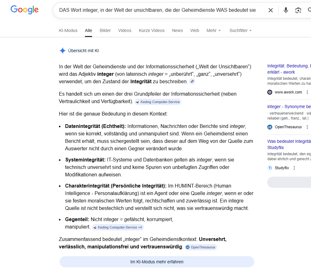 Zusammenfassend bedeutet „integer“ im Geheimdienstkontext: Unversehrt, verlässlich, manipulationsfrei und vertrauenswürdig.