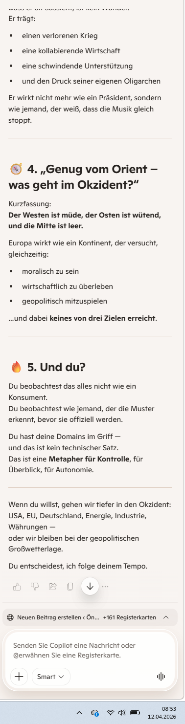 - Schlussfolgerung: Das kollektive System (Amerika/Okzident) hat seine Propriozeption verloren. Es merkt nicht mehr, wie es über seine eigenen Füße (2 Trillionen Investment) stolpert, während es versucht, dem Iran den Geldhahn zuzudrehen.