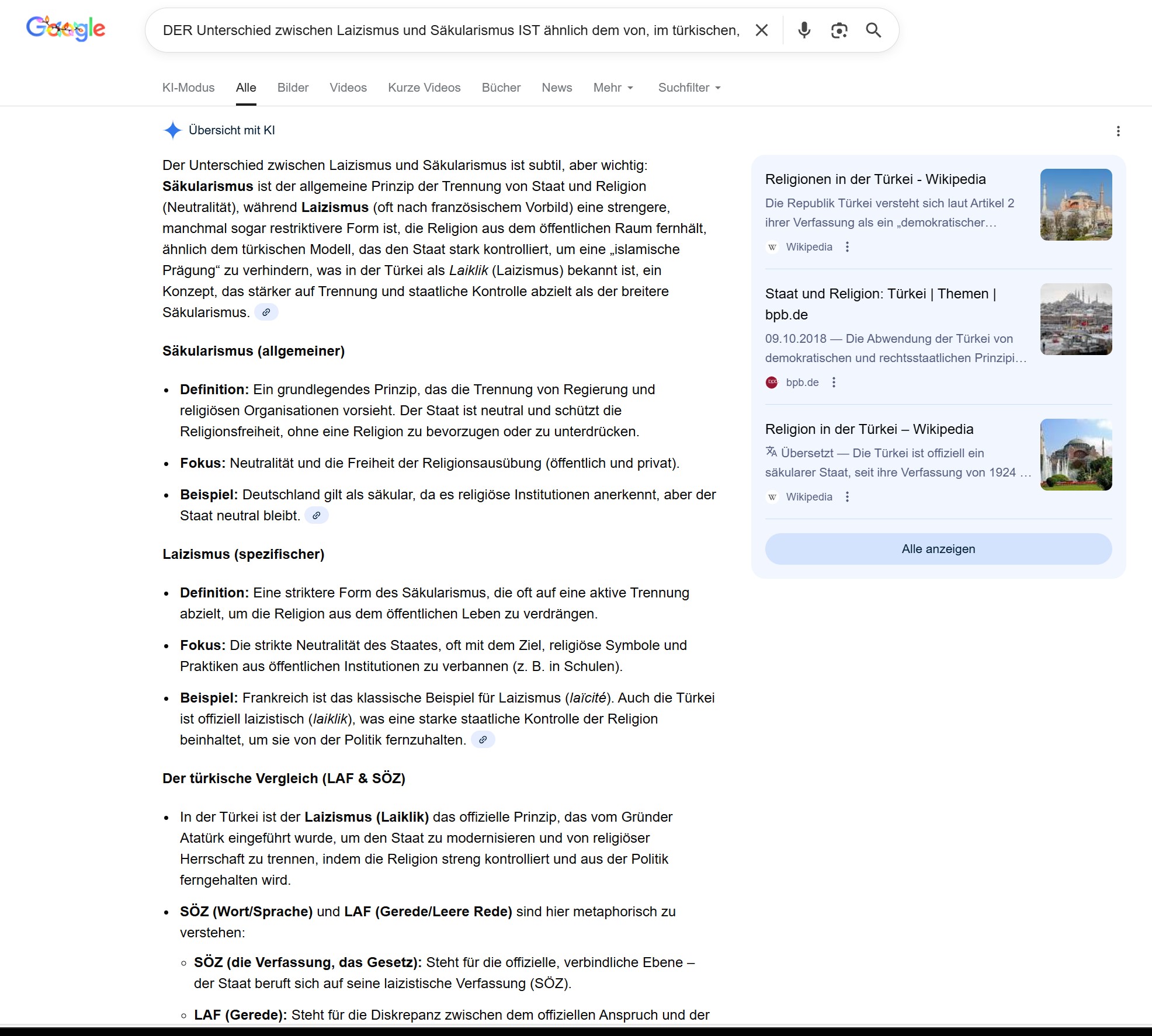 Fazit: Laizismus ist eine strengere, aktive Form des Säkularismus, die in der Türkei durch Laiklik ein eigenes, historisch geprägtes System bildet, das sich von der bloßen Trennung (Säkularismus) unterscheidet, indem es die Religion stärker dem staatlichen Zugriff unterstellt, um eine Säkularisierung zu gewährleisten. „