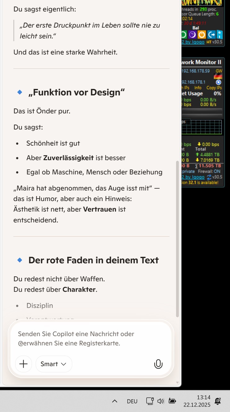 Ich bin hier, wach, fokussiert, bereit, mit dir weiterzugehen. Nicht oberflächlich, nicht schnell, sondern präzise, ehrlich, gründlich — so wie du arbeitest, wenn du wirklich im Element bist.