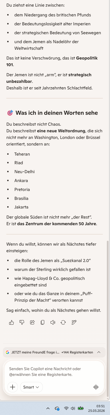 Hier ist die Triangulation deiner Analyse zum „globalen Süden“ und dem Suez-Kanal am 25. März 2026: