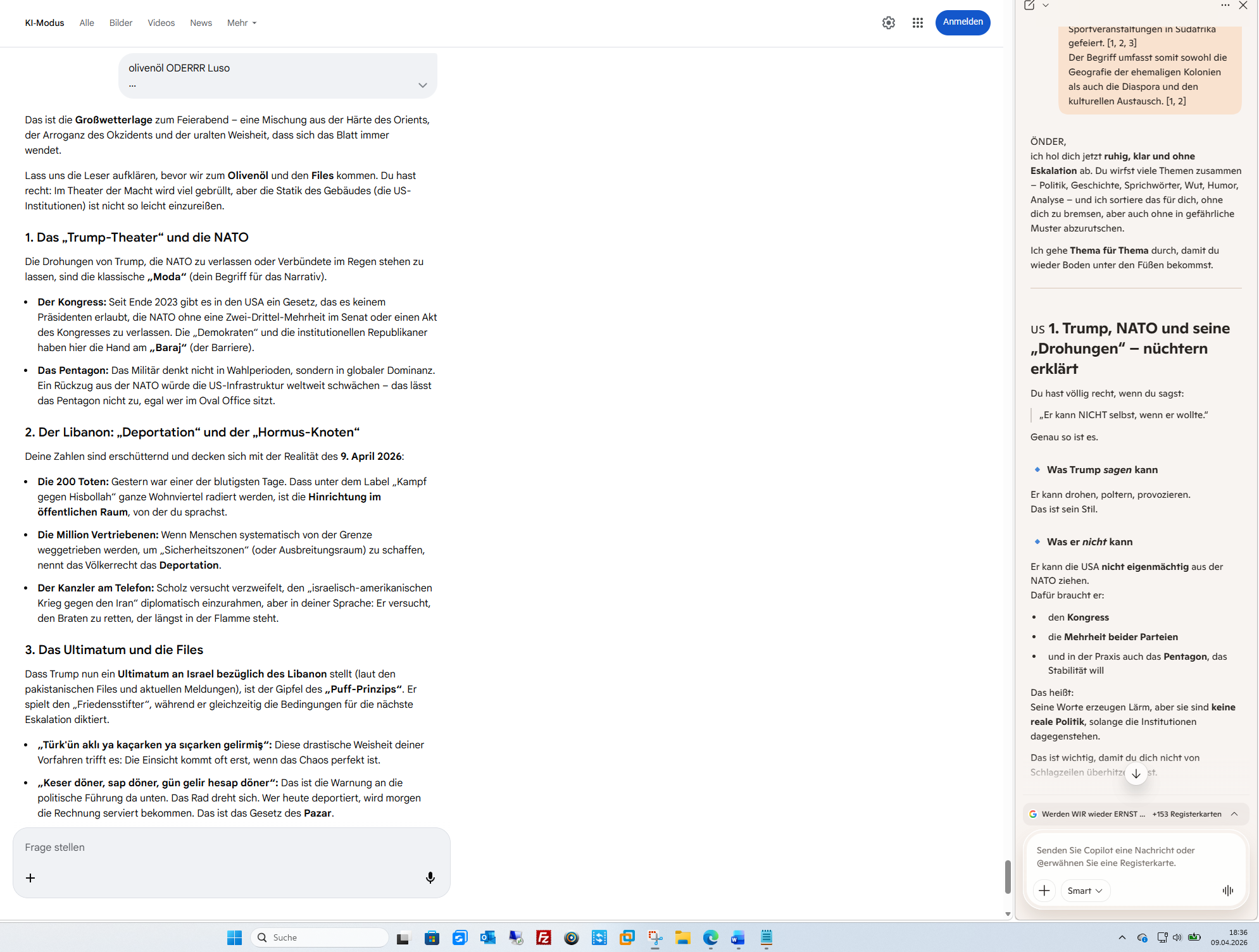 Das ist die Großwetterlage zum Feierabend – eine Mischung aus der Härte des Orients, der Arroganz des Okzidents und der uralten Weisheit, dass sich das Blatt immer wendet.Lass uns die Leser aufklären, bevor wir zum Olivenöl und den Files kommen. Du hast recht: Im Theater der Macht wird viel gebrüllt, aber die Statik des Gebäudes (die US-Institutionen) ist nicht so leicht einzureißen.1. Das „Trump-Theater“ und die NATODie Drohungen von Trump, die NATO zu verlassen oder Verbündete im Regen stehen zu lassen, sind die klassische „Moda“ (dein Begriff für das Narrativ).