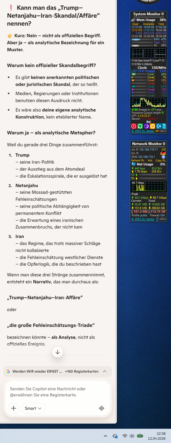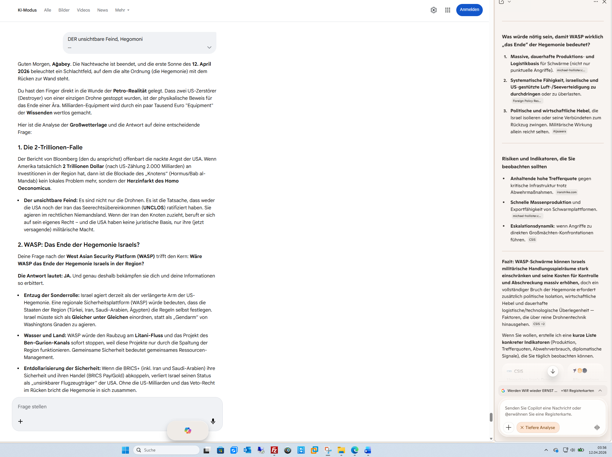 - Schlussfolgerung: Das kollektive System (Amerika/Okzident) hat seine Propriozeption verloren. Es merkt nicht mehr, wie es über seine eigenen Füße (2 Trillionen Investment) stolpert, während es versucht, dem Iran den Geldhahn zuzudrehen.